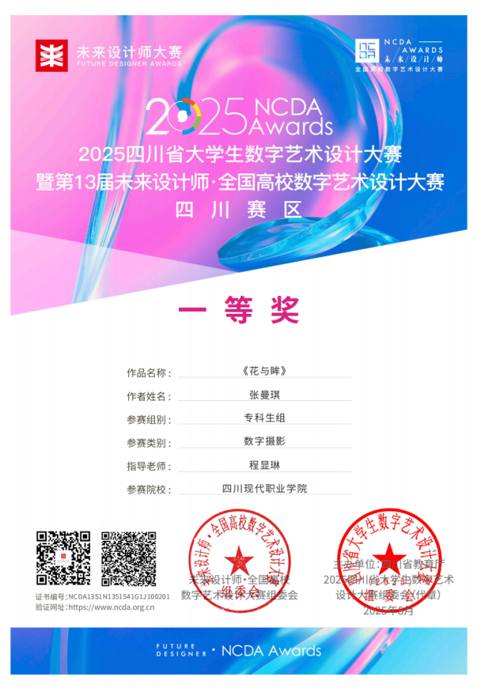 为了进一步深化赛教融合机制,依托大赛“产教融合”特色资源,推动学生作品与实际应用场景对接,持续培养具备创新思维与核心竞争力的数字人才。近日,2025四川省大学生数字艺术设计大赛暨第 13届未来设计师・全国高校数字艺术设计大赛(四川赛区)赛事结果揭晓,我校学子凭借扎实的专业功底与创新的设计理念斩获多项殊荣,充分展现了数字媒体技术专业的教学成果与人才培养实力。
