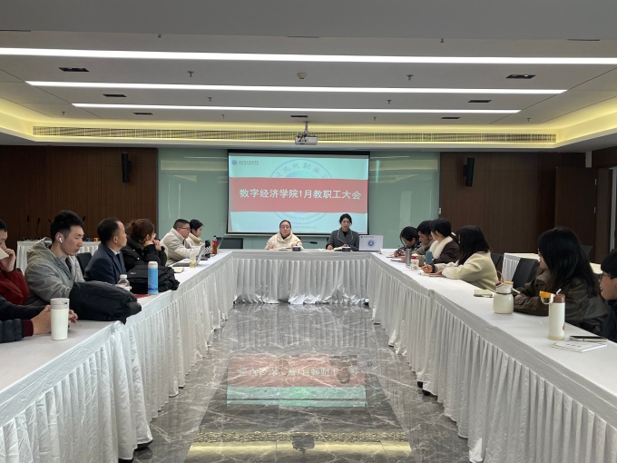 2026 年1月7日,数字经济学院在雅言厅召开1月教职工会议,学校校长助理、学院执行院长周昱宇出席并提工作要求,党总支书记、副院长唐李英主持会议,全体教职工参会。